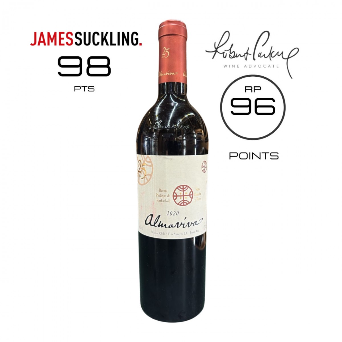 01 GARRAFA 750ML - ALMAVIVA 96RP/98JS - SAFRA 2020 - CHILE - TINTO
